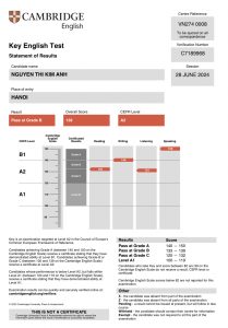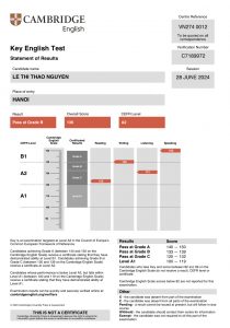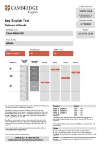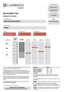 Date: 11 may 2024 Place of entry: HANOI Result: Pass at Grade C Overal Score: 129 CEFR Level: A2